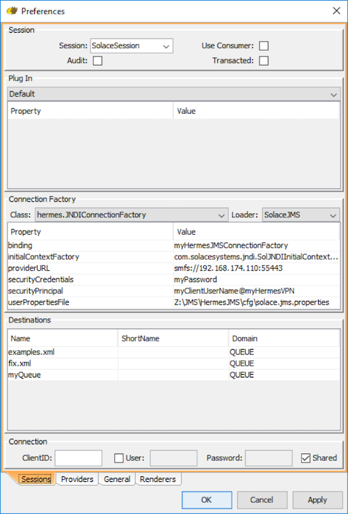 Step 1. Right-click on jms/sessions tree node in the "Sessions" area and select New.../New session... Call it "SolaceSession". Make sure to uncheck Use Consumer and Transacted.