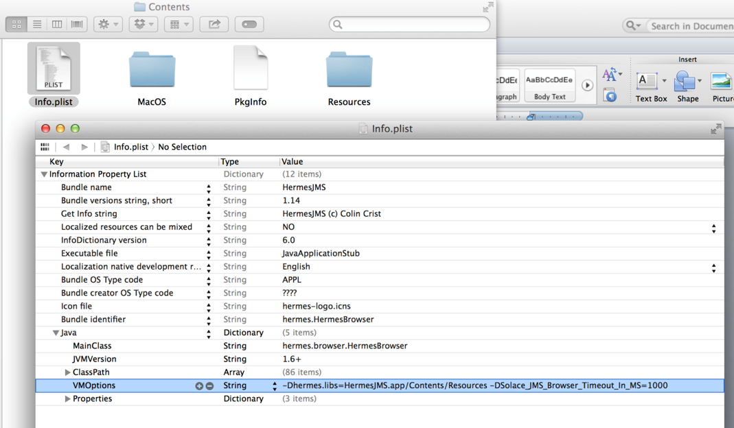 Step 3. Double-click to edit the Info.plist file with the (optionally installed) Apple Xcode editor. Add the string -DSolace_JMS_Browser_Timeout_In_MS=1000 to the Java->VMOptions with a space between the existing options and the new String. Save the change.