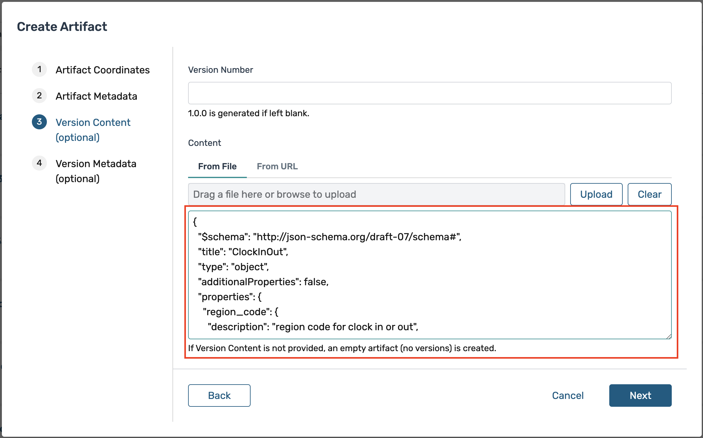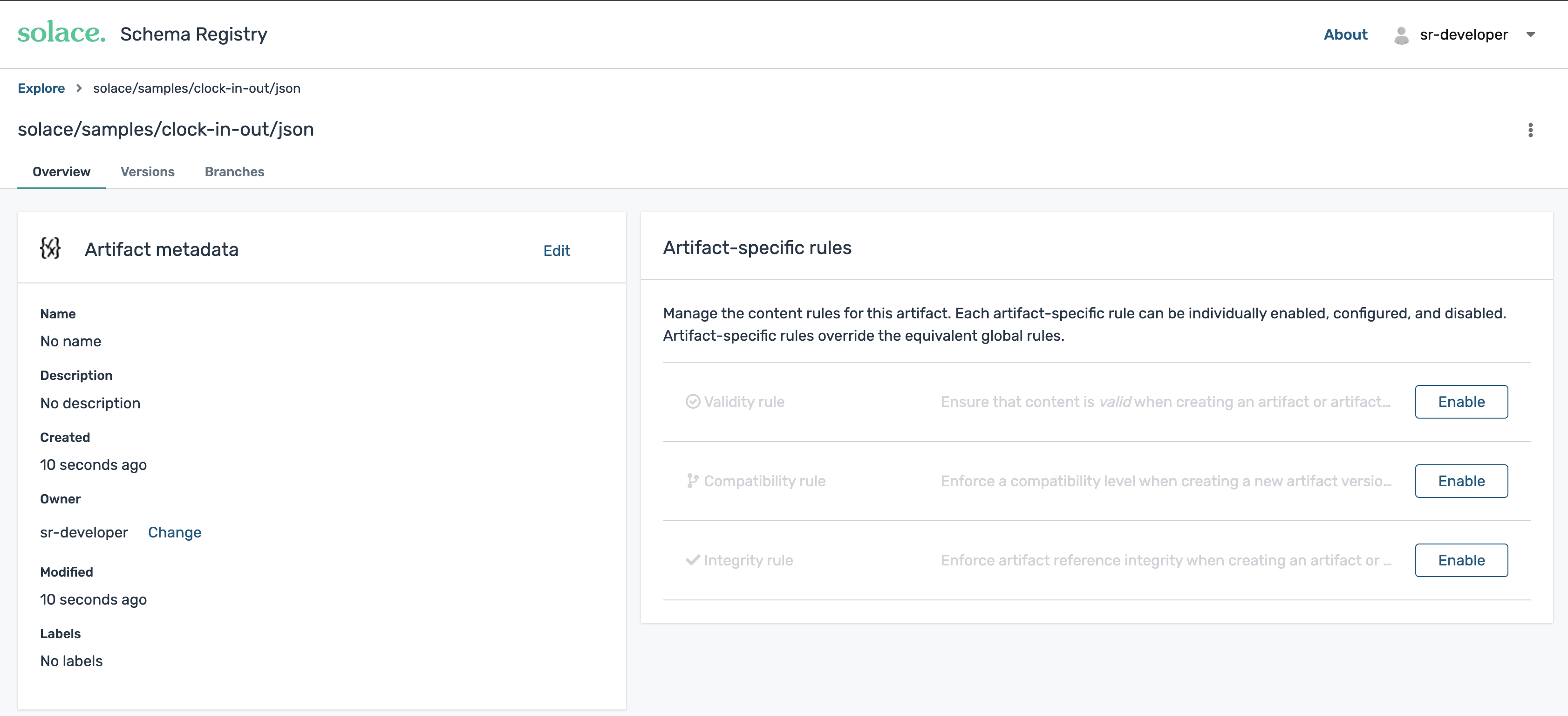 Create artifact button. Once the dialogue opens enter the following as shown below: solace/samples/clock-in-out/jsonJSON Schema
