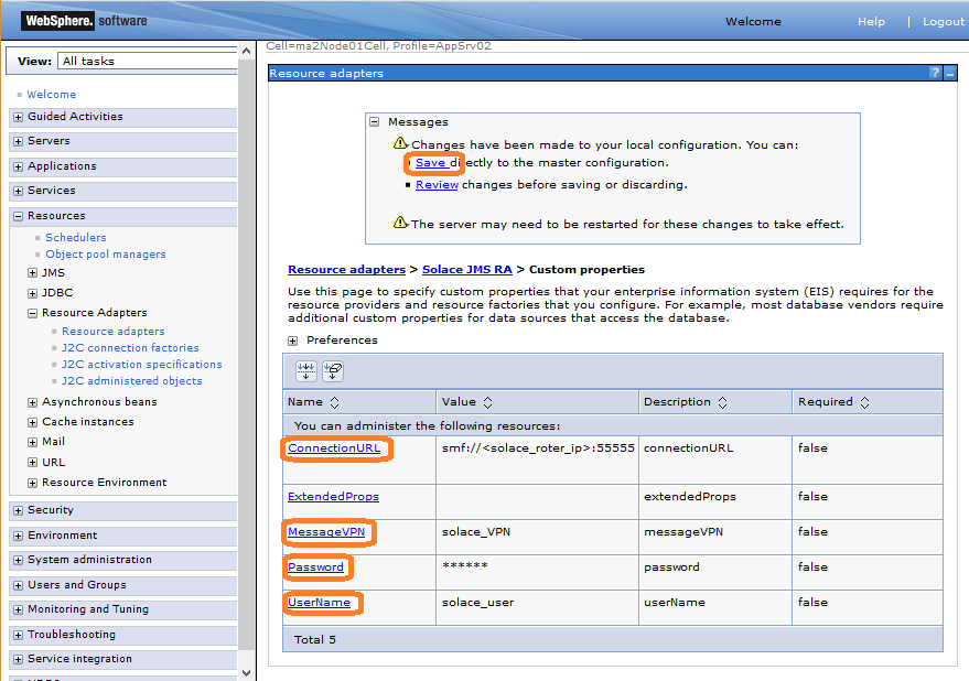 Solace_JMS_Authentication_Scheme=AUTHENTICATION_SCHEME_BASIC;Solace_JMS_SSL_TrustStore=___Path_or_URL___;Solace_JMS_SSL_TrustStorePassword=___Password___;Solace_JMS_SSL_TrustStoreFormat=jksiii. Click on the "Apply" button.iv. Click the "Save" link to commit the changes to the application serverThis section demonstrates how to configure the Solace event broker to support the transaction processing capabilities of the Solace JCA Resource Adapter. In addition, code examples are provided showing JMS message consumption and production over both types of Enterprise Java Bean transactions: Container-Managed-Transactions (CMT) and Bean-Managed-Transaction (BMT) configuration.