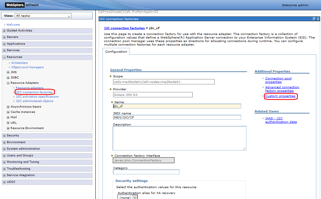 J2C connection factory | j2c_cf | JNDI/J2C/CF | A J2C entity used to access a Solace javax.jms.ConnectionFactory (For Outbound messaging) |